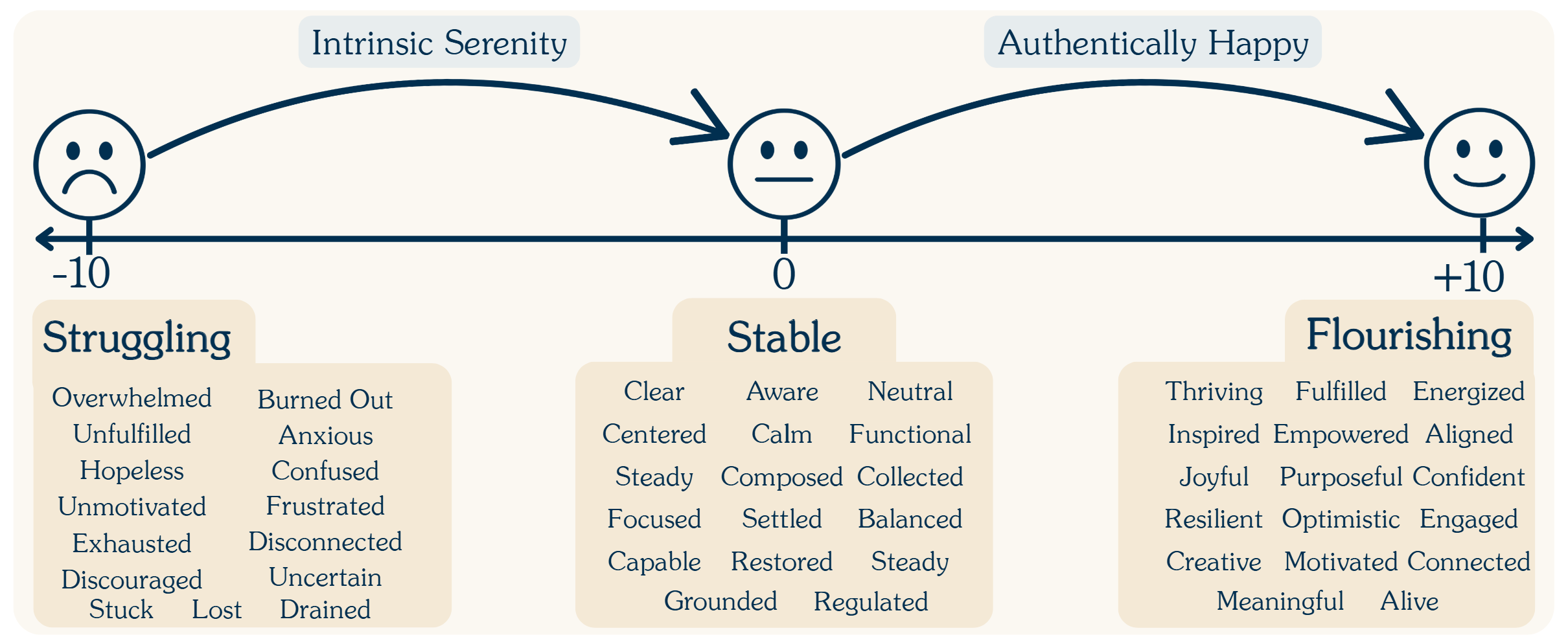 At Authentically Happy®, our programs are designed to guide you along this journey, from struggling to flourishing, by providing the right type of support at each stage of growth.